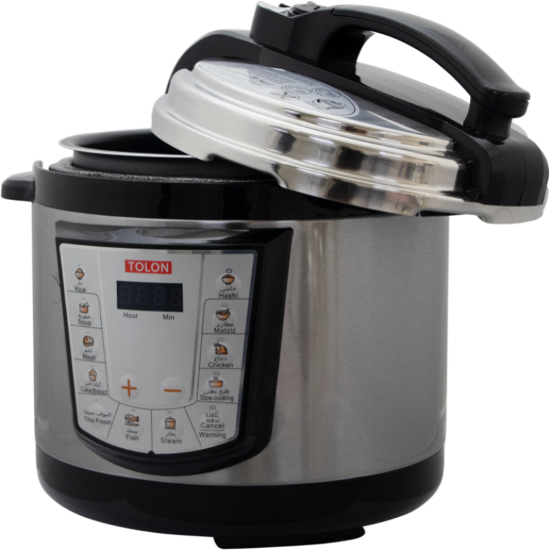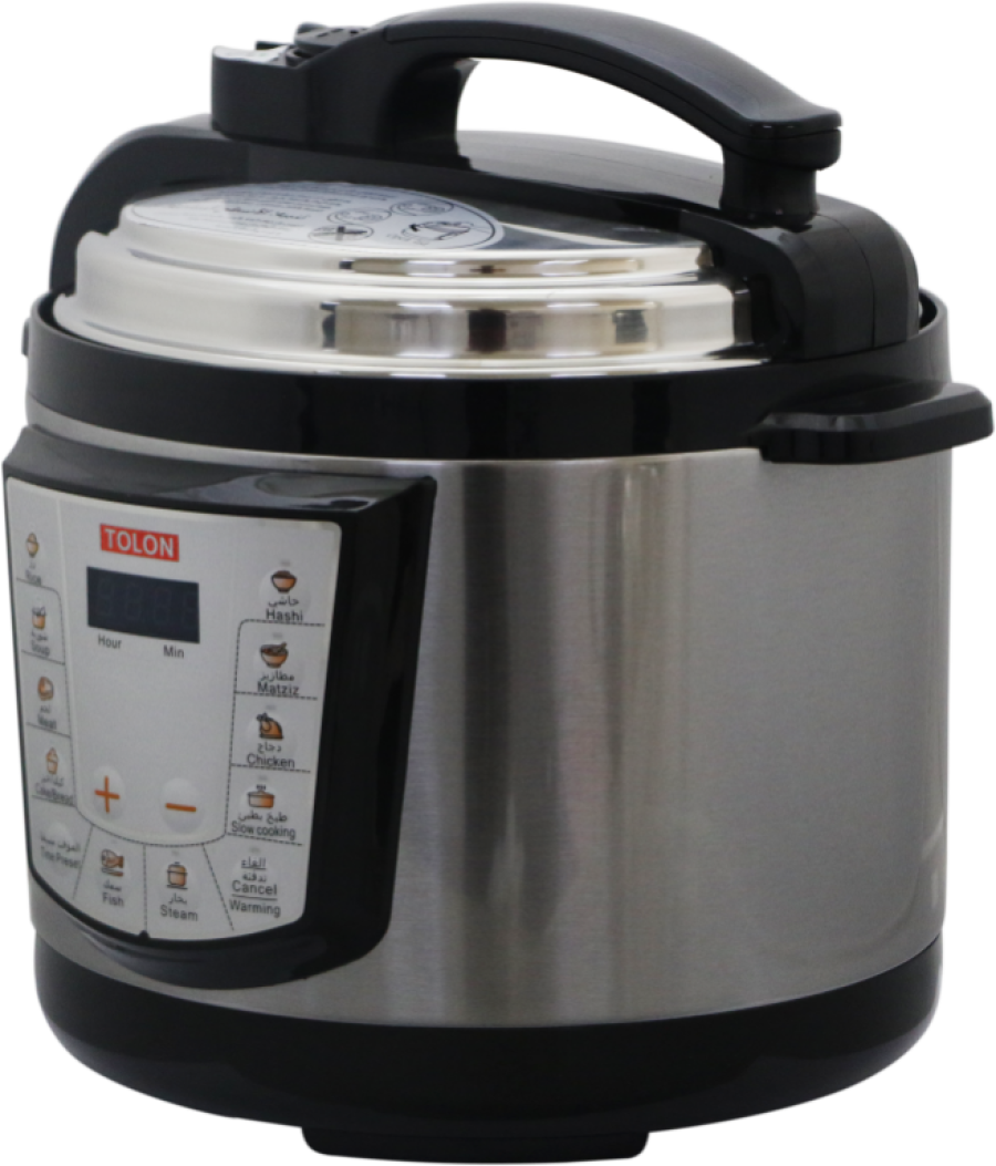 قدر ضغط كهربائي 6 لتر مصنوع من مواد عالية الجودة مقاومة للصدأ وغير قابل للالتصاق يمكنك طهي الأرز واللحوم و الأسماك والكيك والخبز والحساء .... الخ متعددة الوظائف لوحة تحكم سهلة القراءة تعمل باللمس مع شاشة LED مزودة بأجهزة حماية سلامة متعددة مؤقت طهي مضبوط مسبقاً لمدة 24 ساعة السعة : 6 لتر القوة : 1000 واط الجهد الكهربائي : 220 / 240 فولت التردد : 50 / 60 Hz الملحقات : وعاء طهي داخلي ( غير لاصق ) ، كوب قياس بلاستيكي ، ملعقة رز ، ومغرفة شوربة الضمان : 3 سنوات